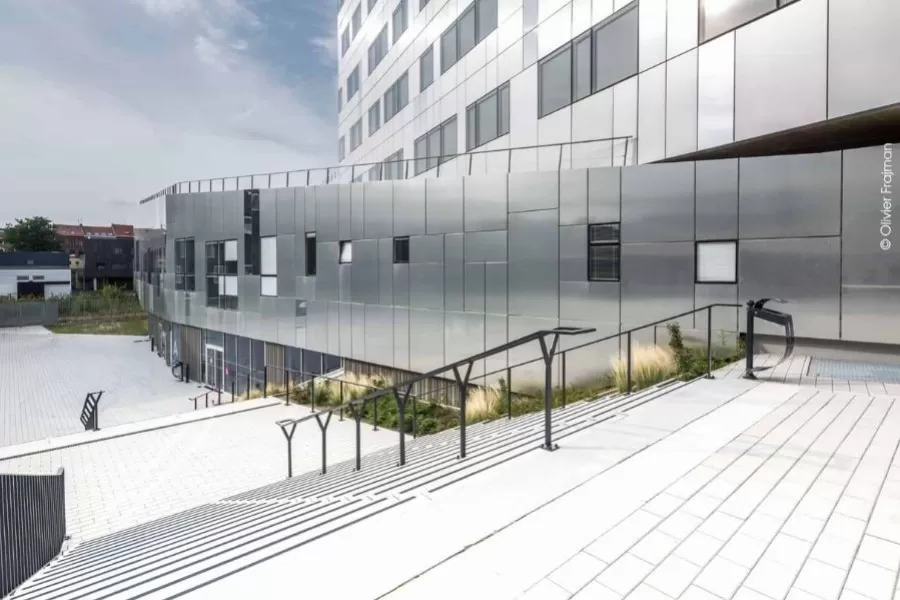 L’ensemble dialogue avec les châssis vitrés, intégrés au même nu que le bardage. Ce traitement homogène donne de la cohérence aux 4 000 m² de façades visibles depuis le croisement de la rue de l’Alma et du boulevard des États-Unis.